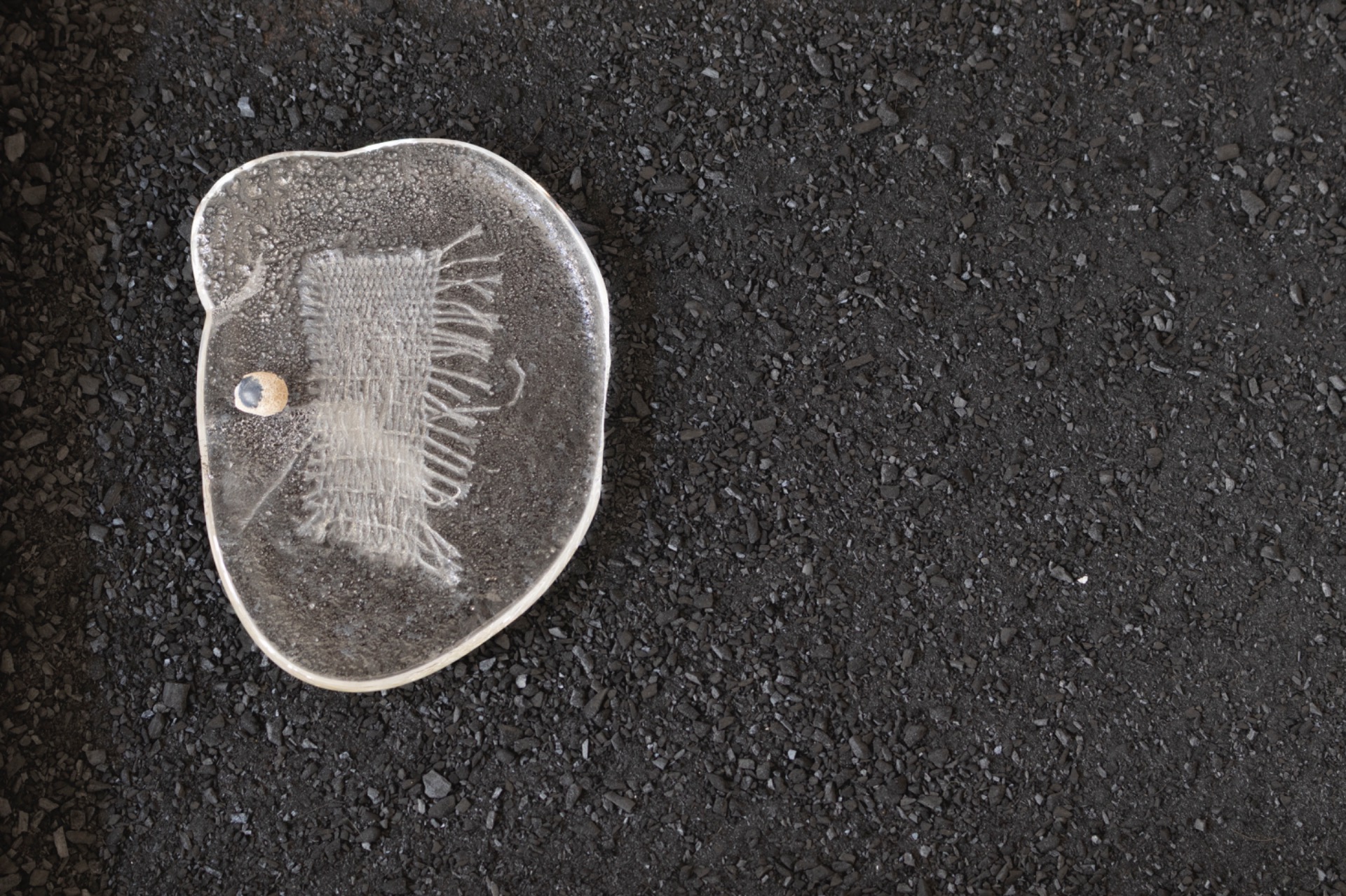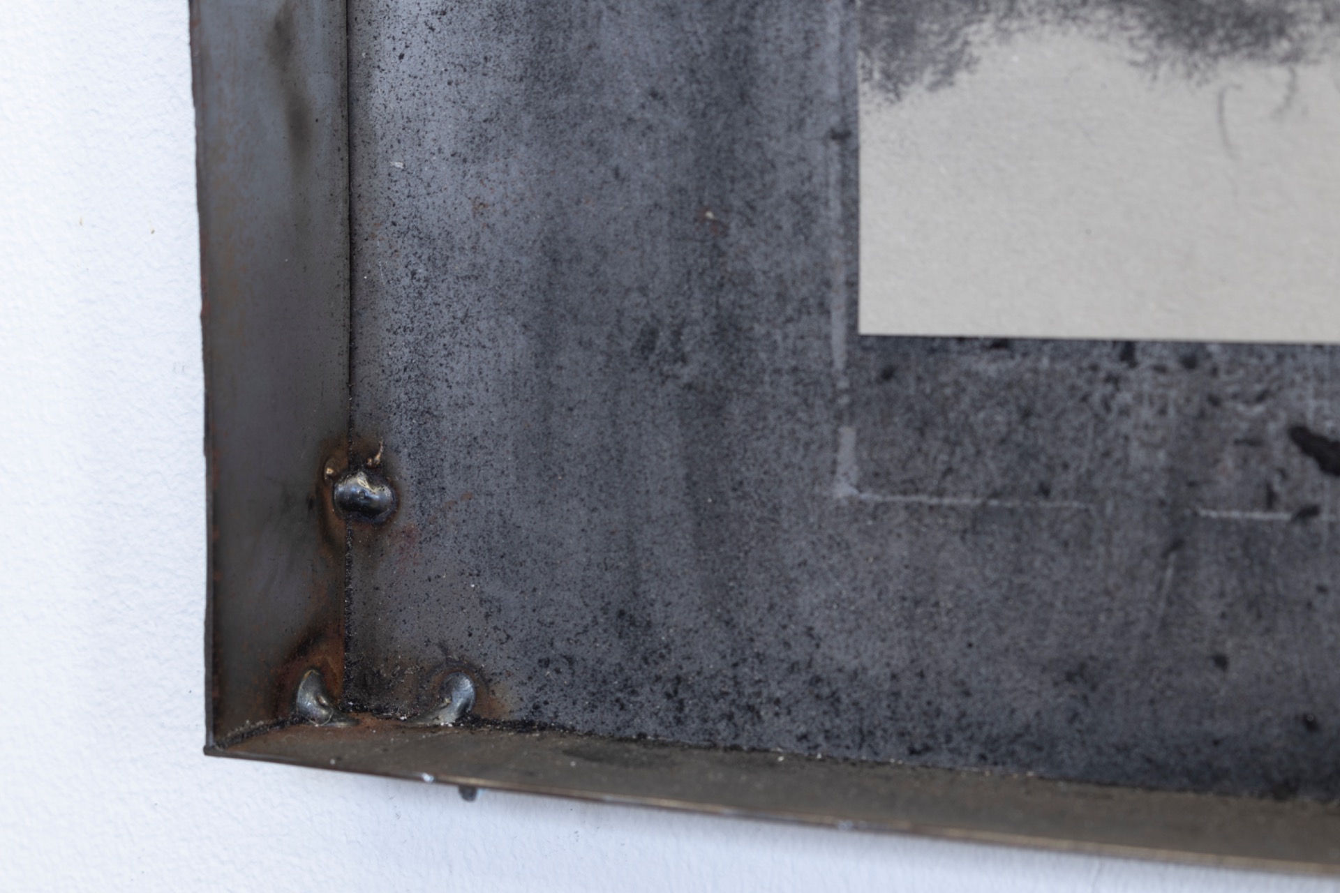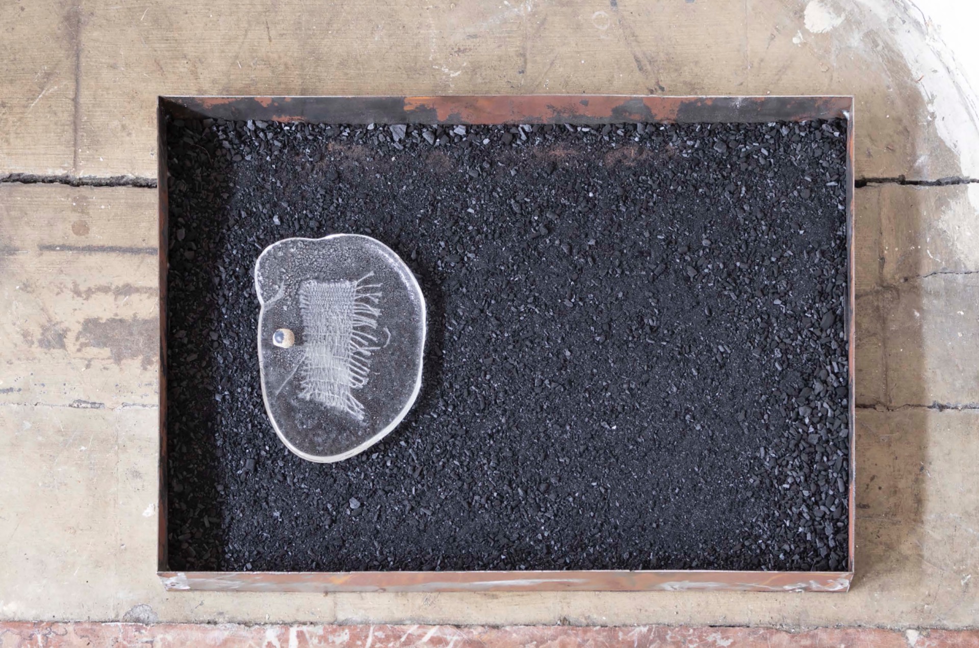 Zij, die draaien, 2025, steel, ground charcoal, glass and shell, 42 x 29,5 x 3,5 cm.