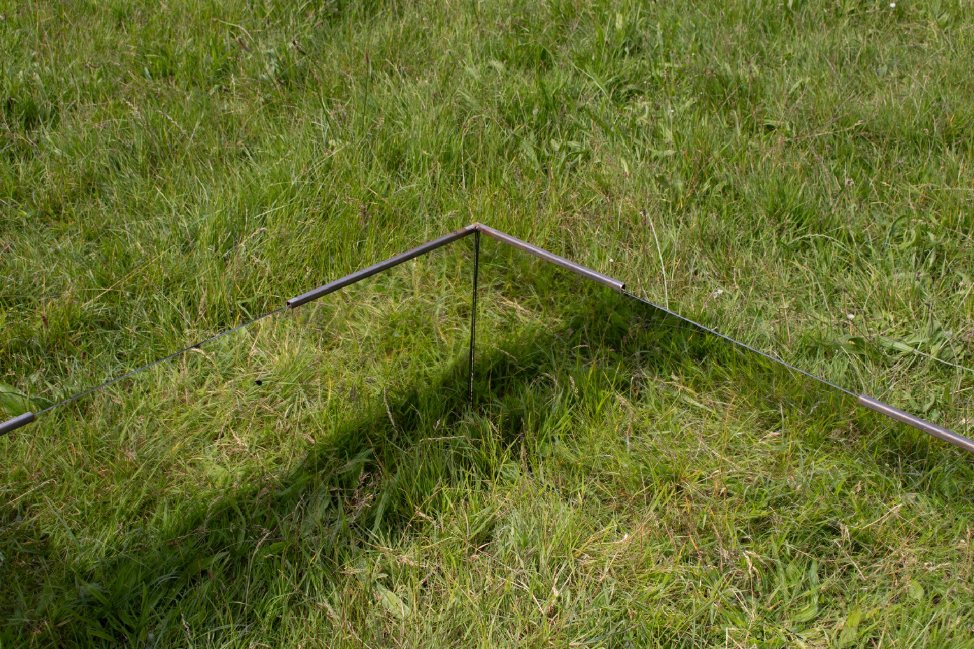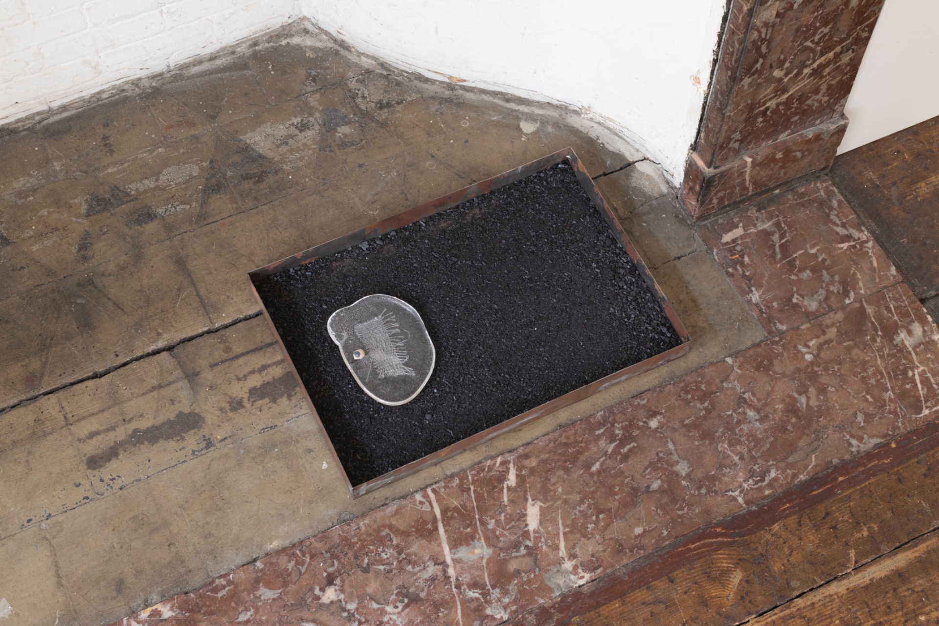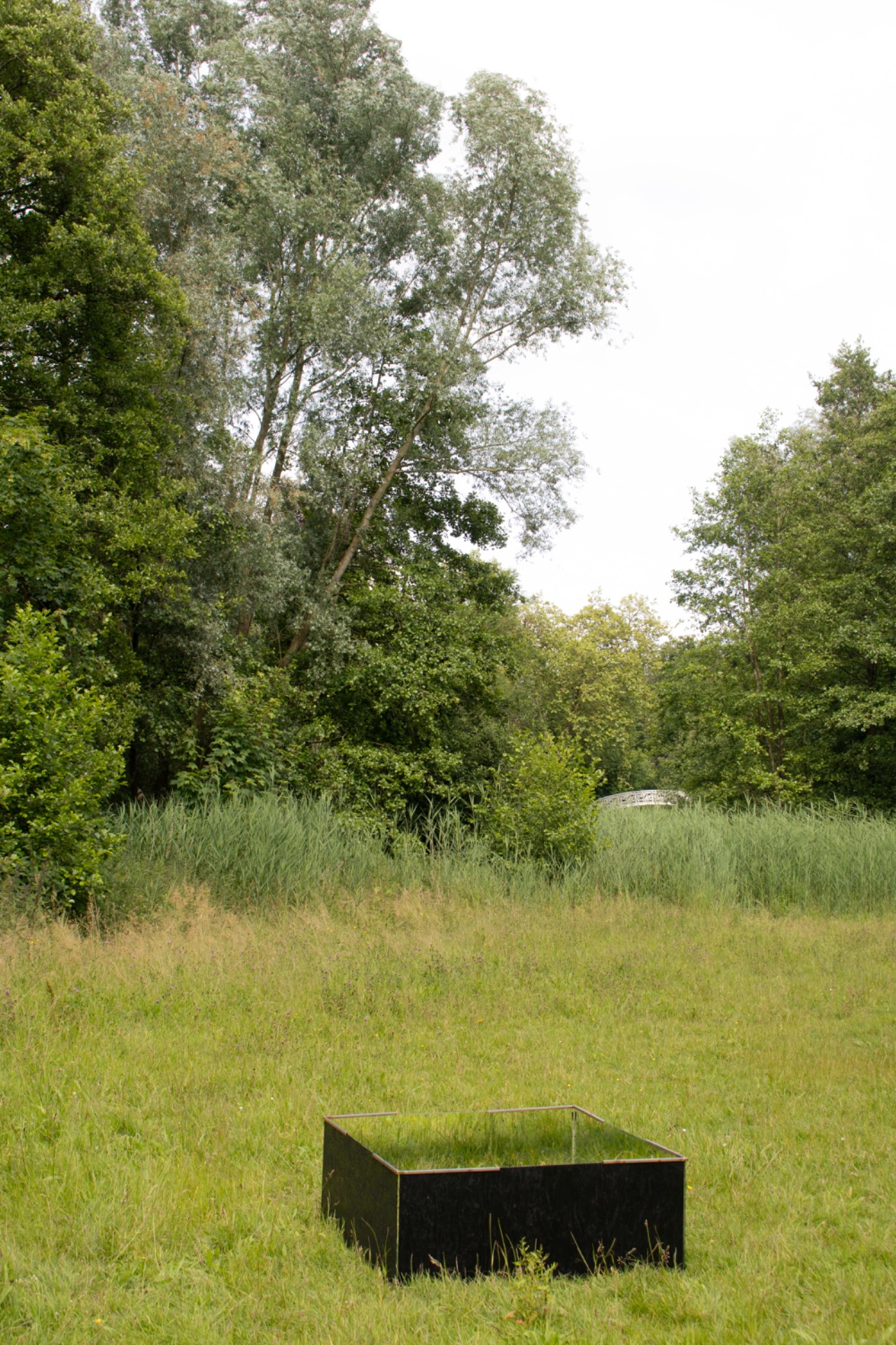 Installation: Ik stond weer in de weide, 2024, mirrors, steel, tar and charcoal, 120 x 120 x 40 cm.