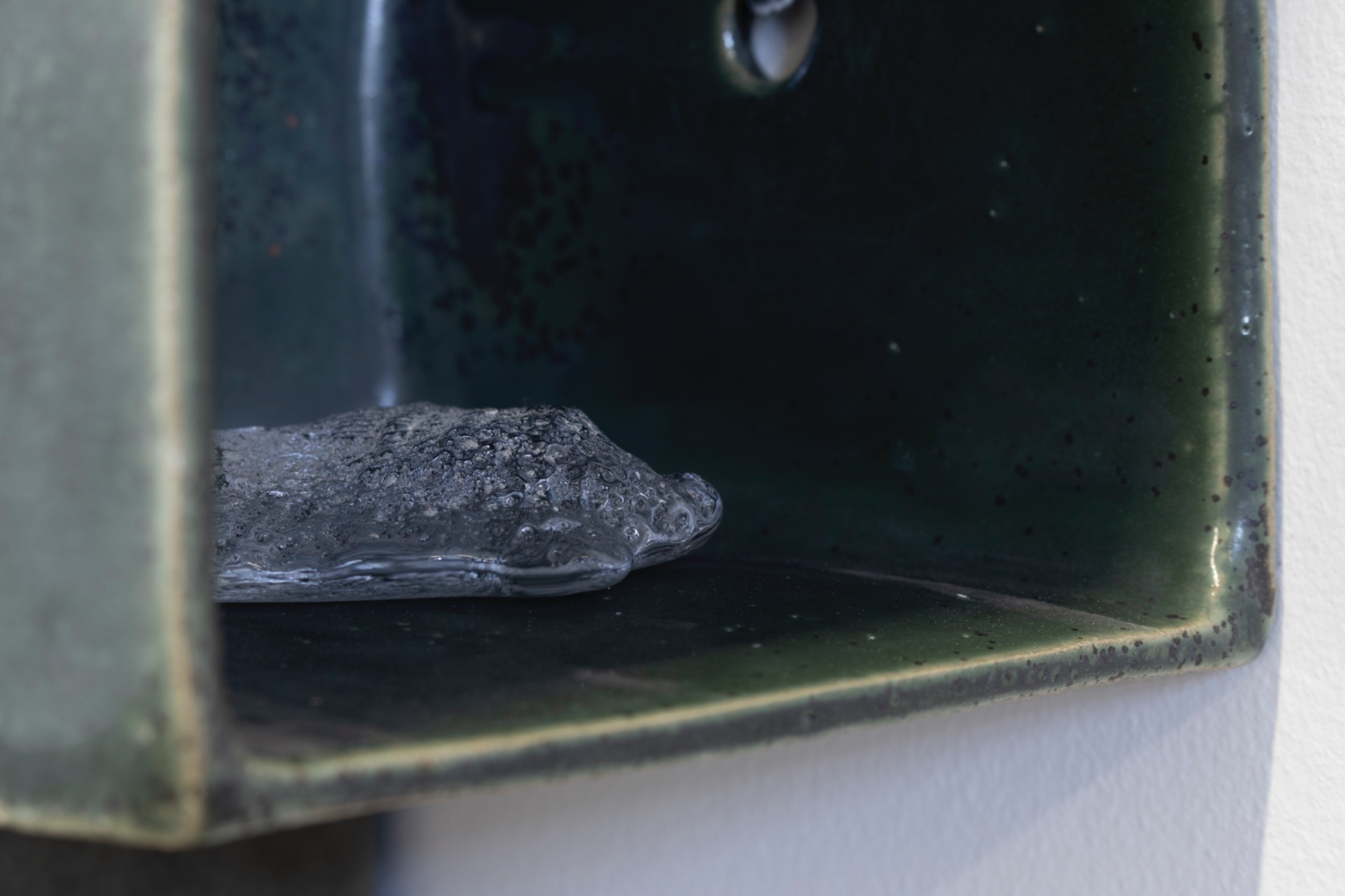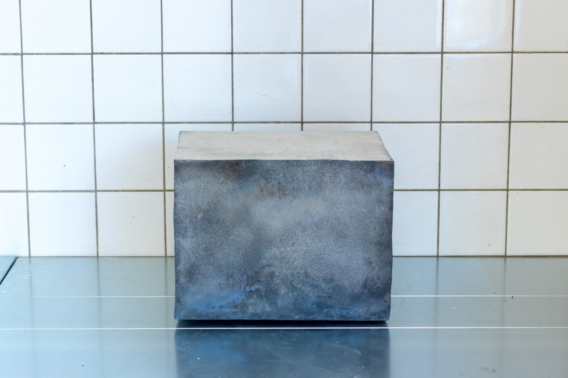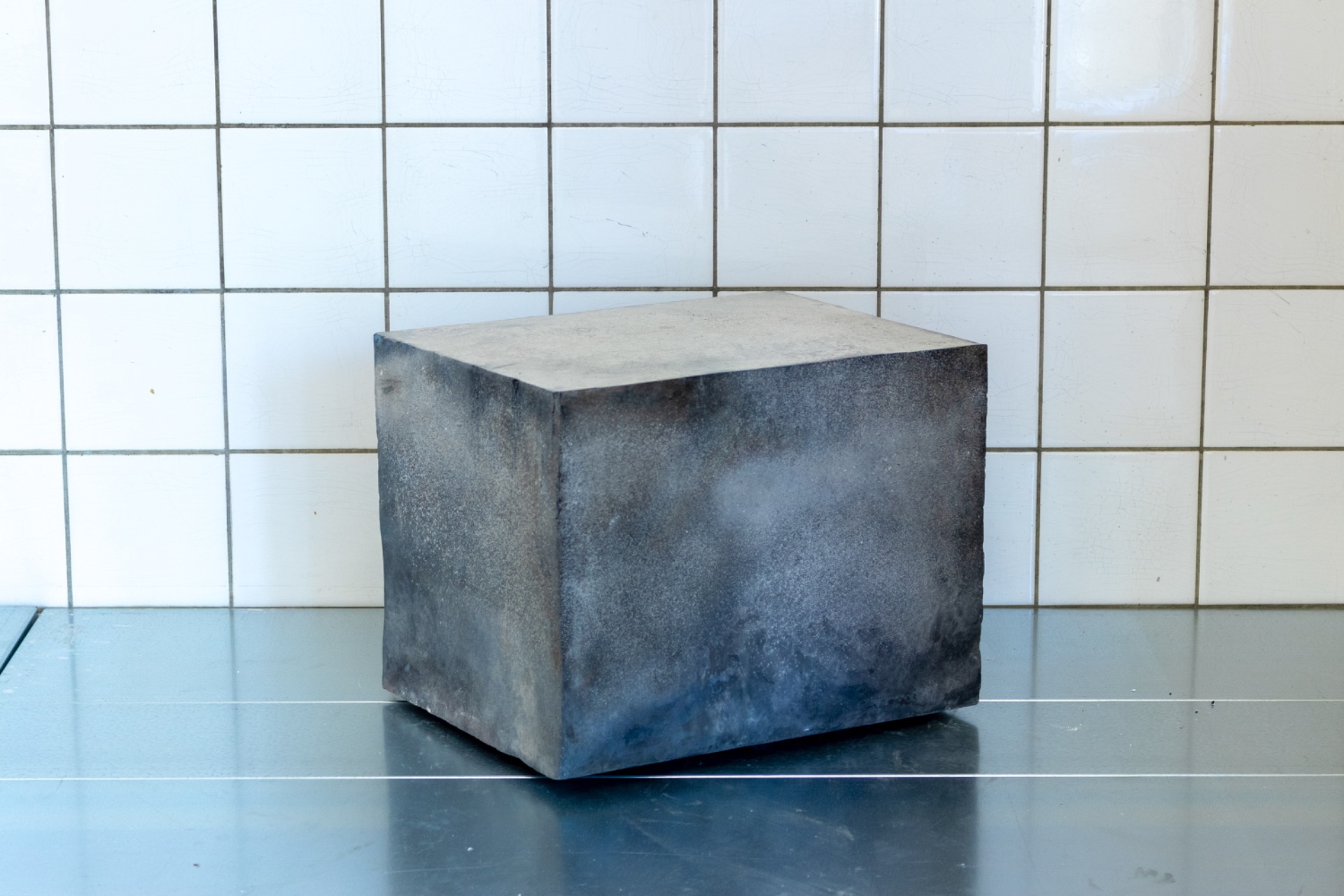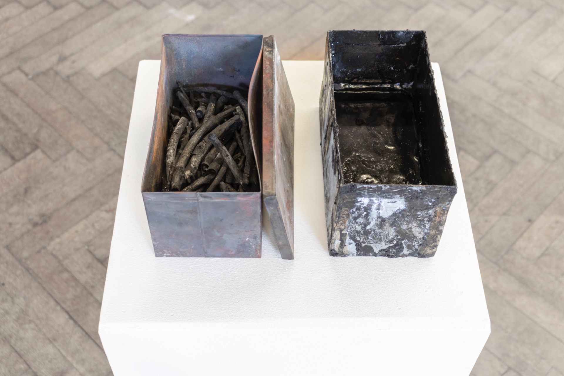 En dan gewoon luisteren, 2023-2024, two steel boxes with charcoal and tar, both 11,7 x 11,5 x 23,2 cm.