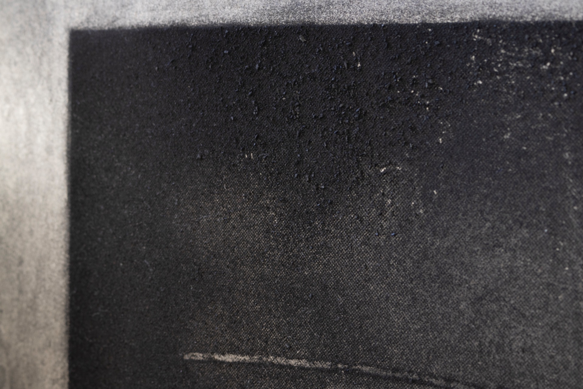 Ik verloor iets in de bergen, 2024, silkscreen print of glue with charcoalpowder, 100 x 70 cm.
