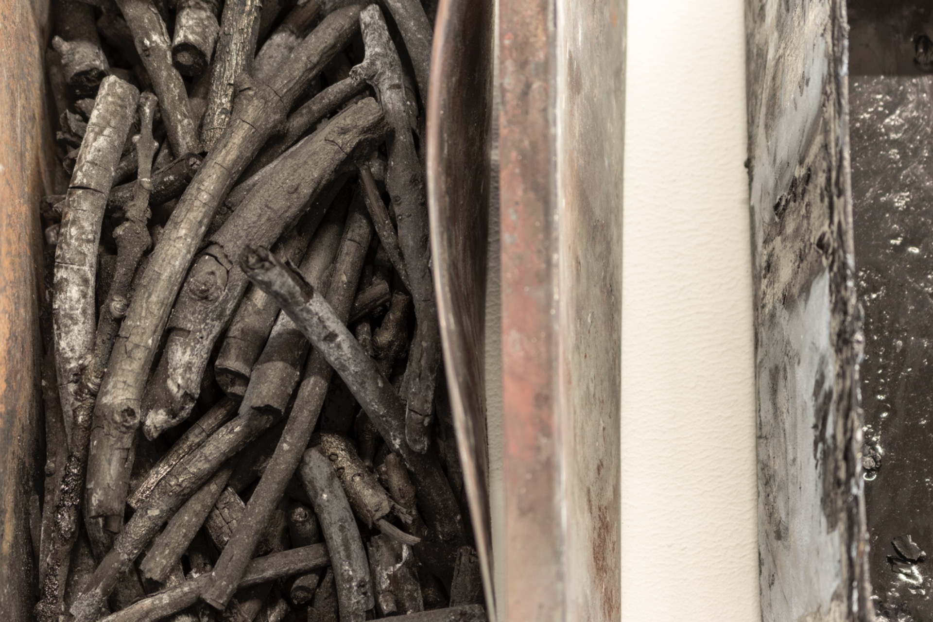 The Year, 2025, cardboard, branches, steel, fire and ash, 30 x 30 x 40 cm.