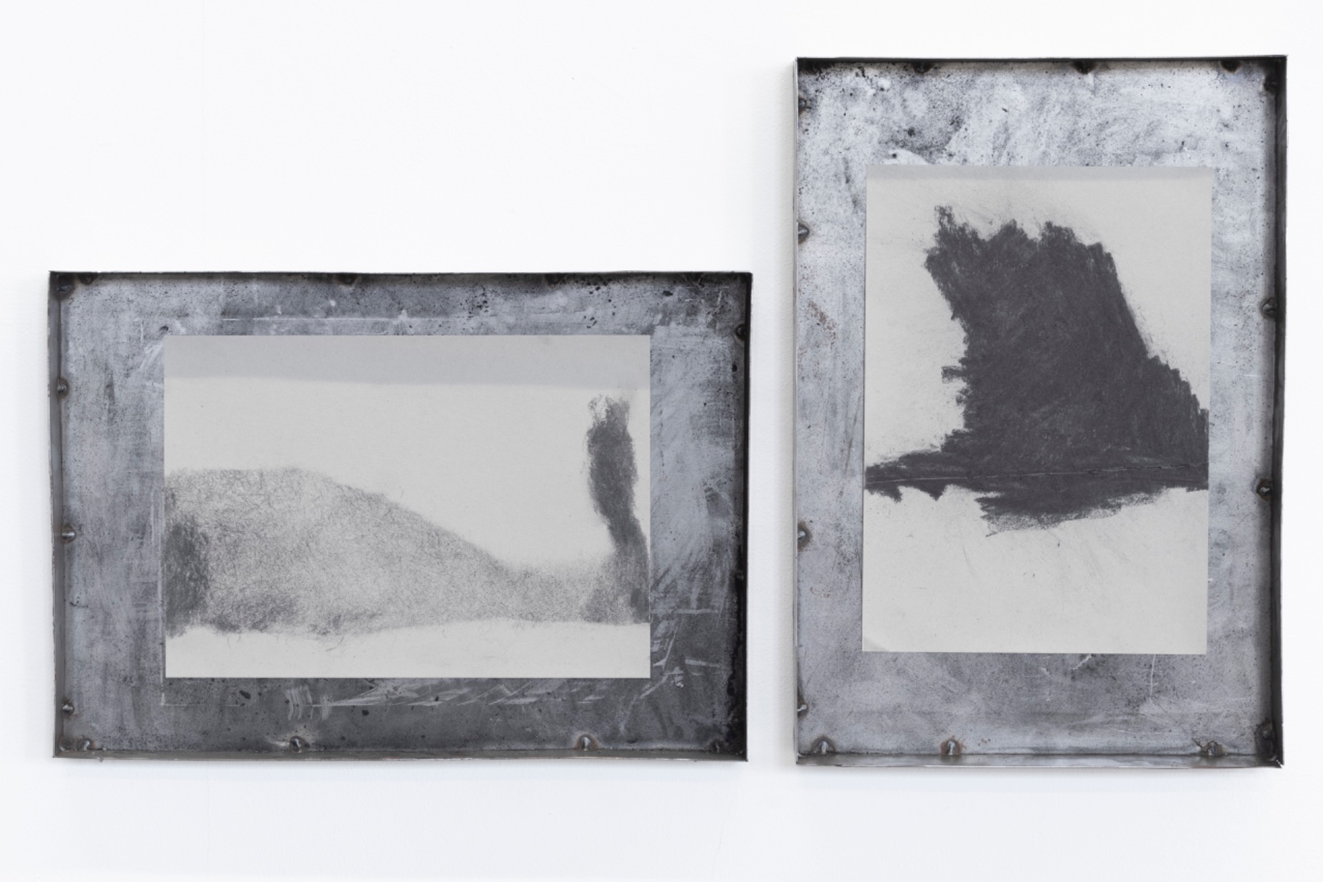 Landschap I en II, 2024, relief print of felt, charcoal on paper with steel canvas, both 42,5 x 29,5 cm.