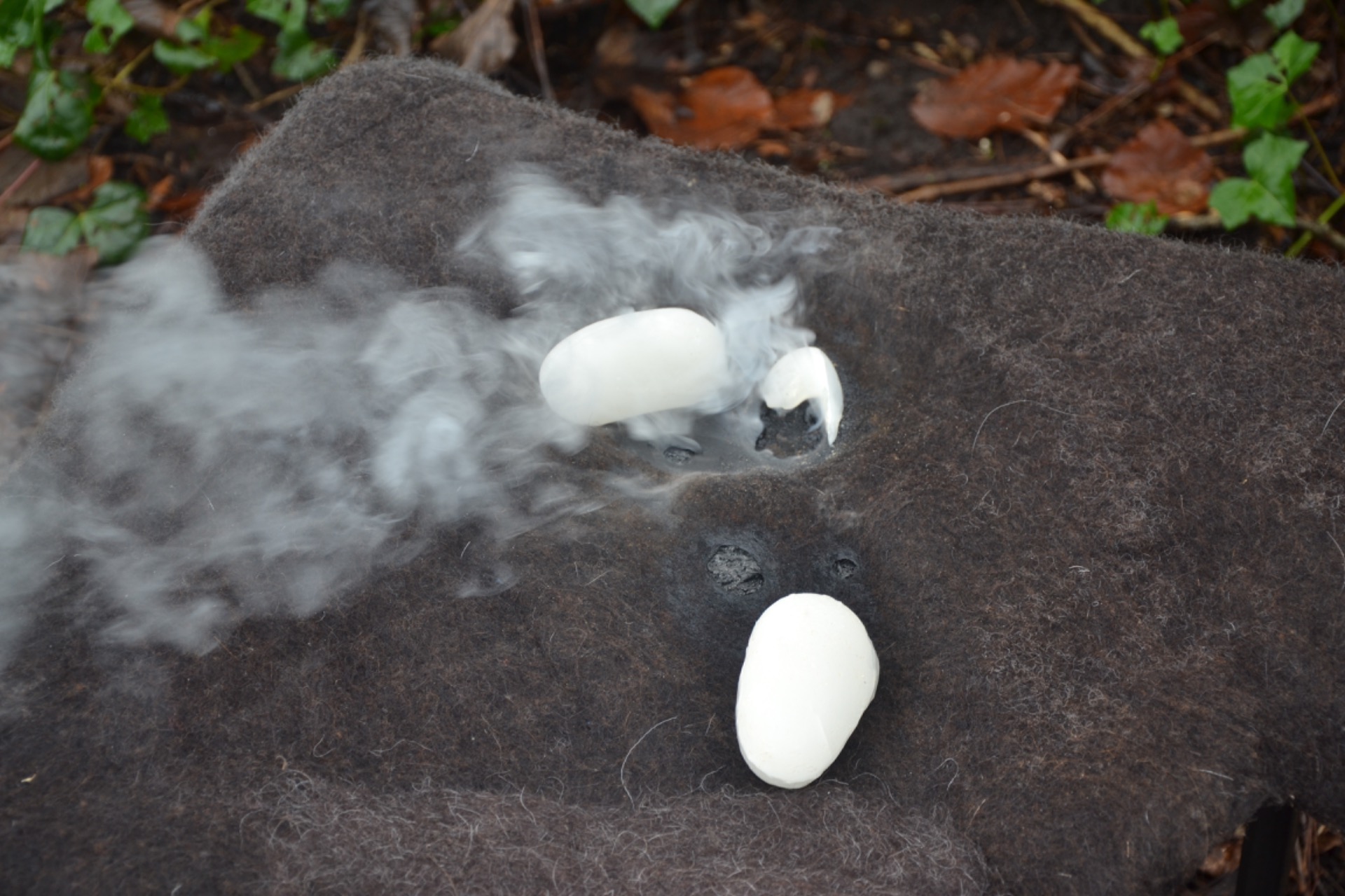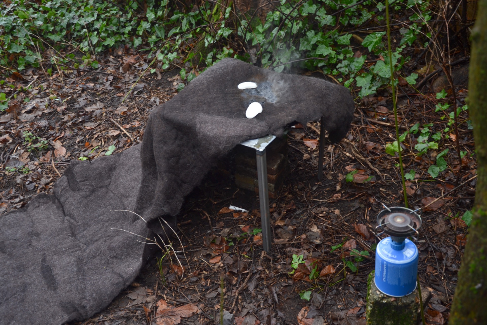 Installation: Steen, 2023, felt, steel, gas burner and paraffine, measurements variable.