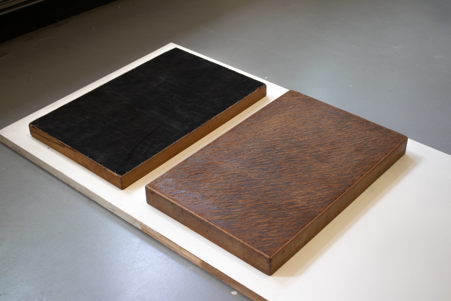 Notities van niets, 2022, wood with charcoal drawing and woodcut with graphite, both 70 x 50 cm.